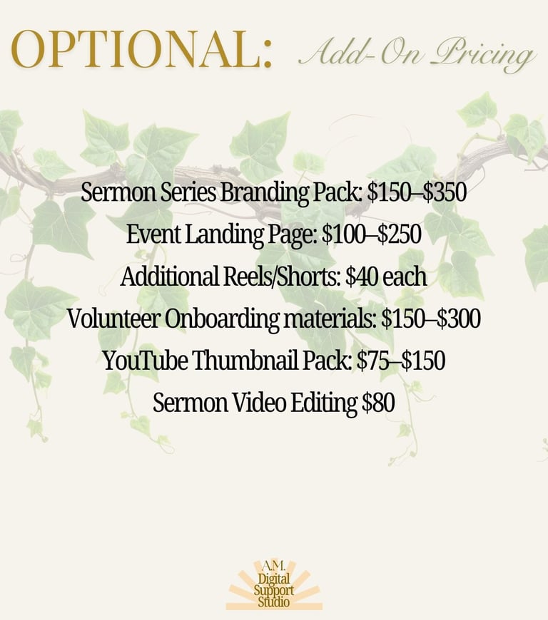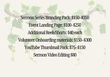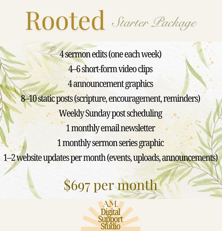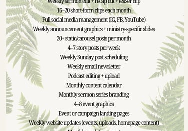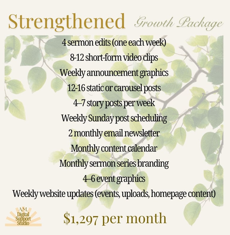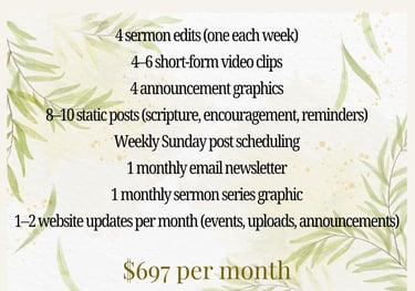 Provides the essential creative and administrative support churches and ministries need to stay consistent online. Perfect for church plants, small ministries, or any team that needs foundational digital help without overwhelm.